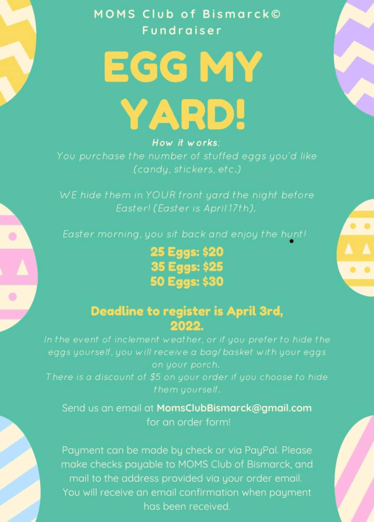 For questions or to request an “Egg My Yard” order form, email us at momsclubbismarck@gmail.com. Forms must be submitted by Sunday, April 3rd.