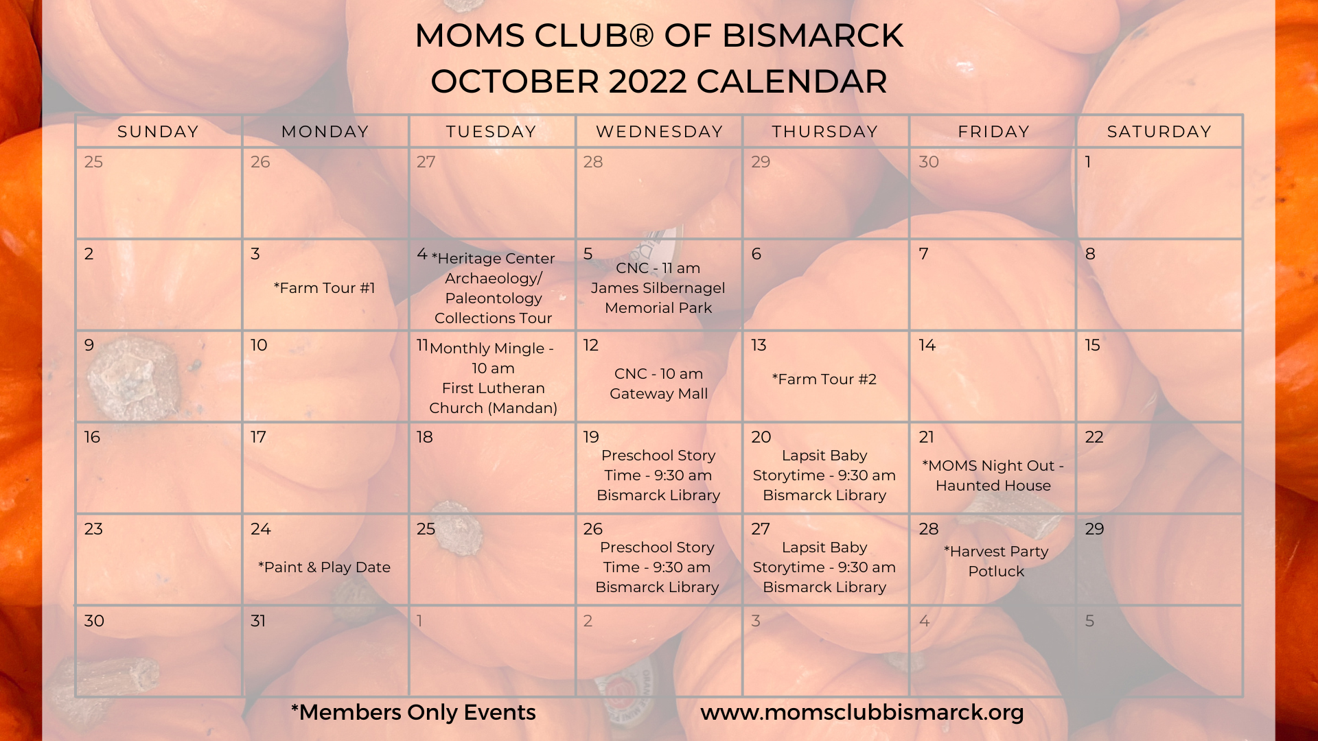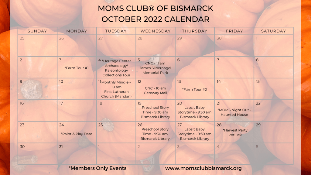 Happy fall, y’all! We’re looking forward to these exciting events in October. If you’re a stay-at-home or part-time working mom in the Bismarck/Mandan/Lincoln area, please join us! Send an email to momsclubbismarck@gmail.com or direct message us through our public Facebook page to let us know you’re coming.