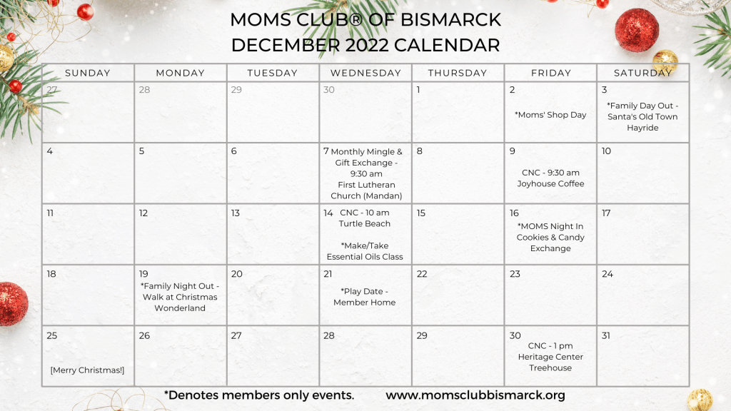 Not a member yet but would like to join? Curious to learn more without making any commitments? We’d love to meet you at one of our public events! Just send an email to momsclubbismarck@gmail.com or direct message us through our public Facebook page. Happy holidays!