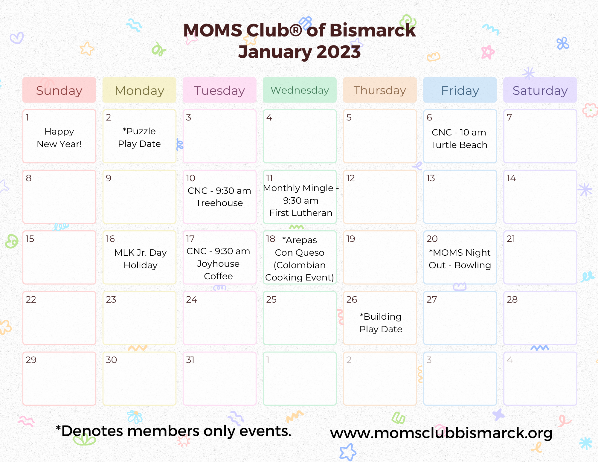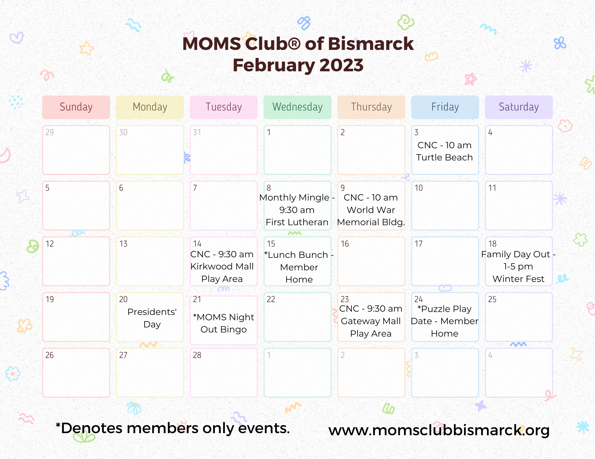 Here are the events that MOMS Club® of Bismarck has planned for February! If you’re a member, please check the private Facebook group for additional details and to RSVP.