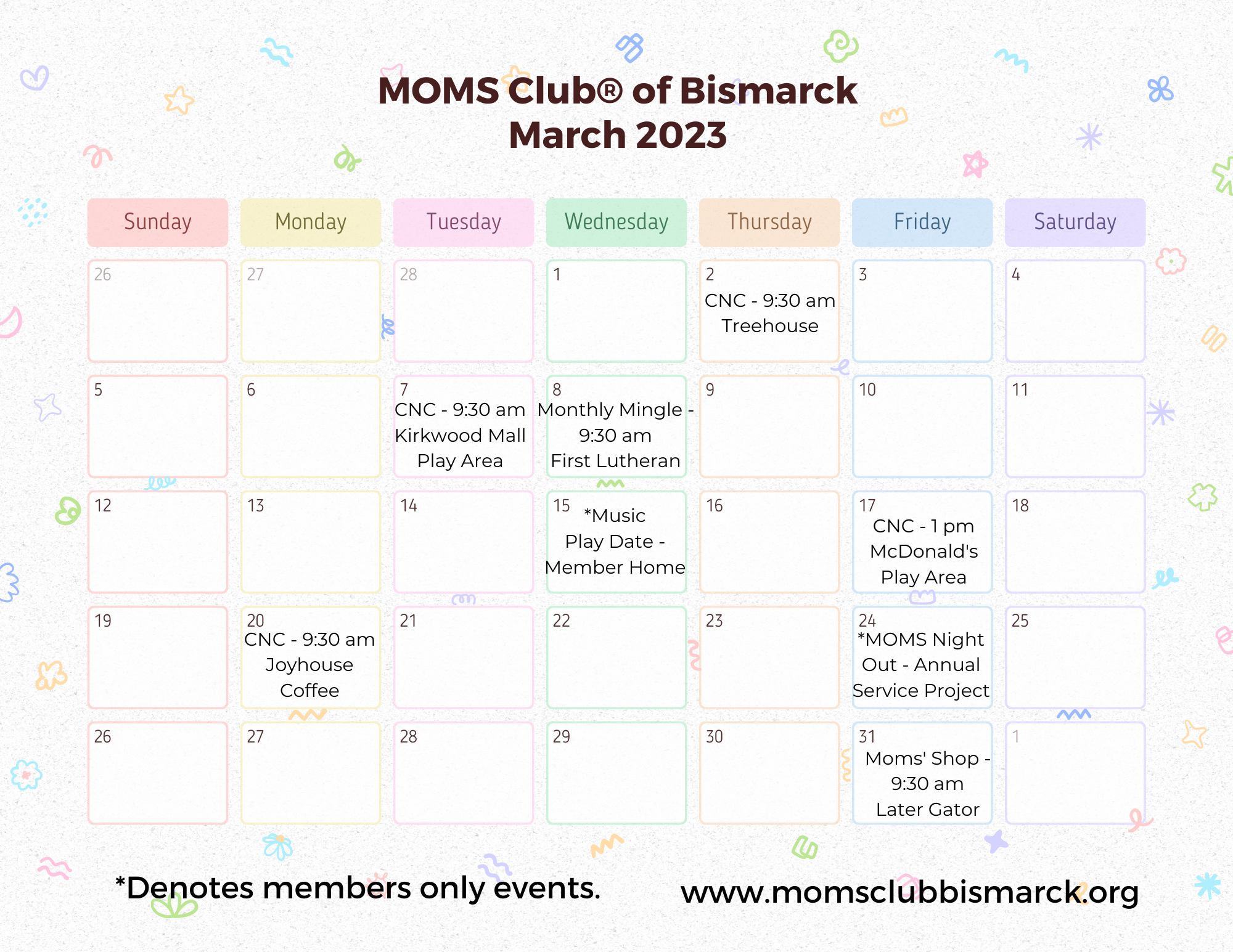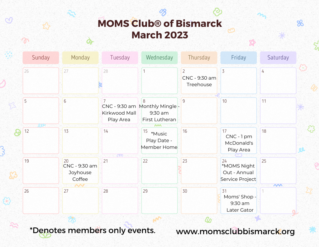 Get out of the house and make some new mom and kid friends this month! Email us at momsclubbismarck@gmail.com or direct message us through our public Facebook page, and we’ll send you additional details. Once you join, we will add you to our private Facebook group and email list.