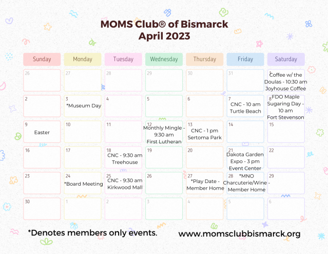 Check out one of our public events! Email us at momsclubbismarck@gmail.com or direct message us through our public Facebook page to introduce yourself.