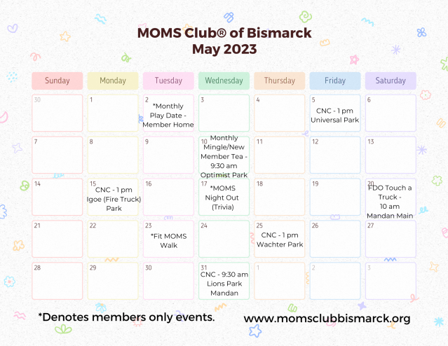With a turn of the calendar, it is officially May, spring has FINALLY arrived in North Dakota, and we’re so excited to host our events outside! If you are not a member of MOMS Club of Bismarck yet, please join us at one of our public events. We are here to help stay-at-home and part-time working moms and their kids find a “village,” meet new friends, and make memories. (Learn more about us on our FAQ page.)