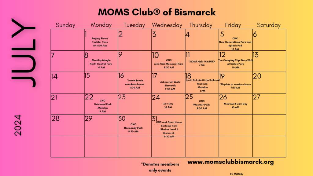If you’re not a member yet, we’re so happy you found us! Please drop by one of our public events to meet us and see if our group would be a good fit for you. Events can change due to weather, so please email us at momsclubbismarck@gmail.com or DM our public Facebook page to let us know if you’ll be attending.